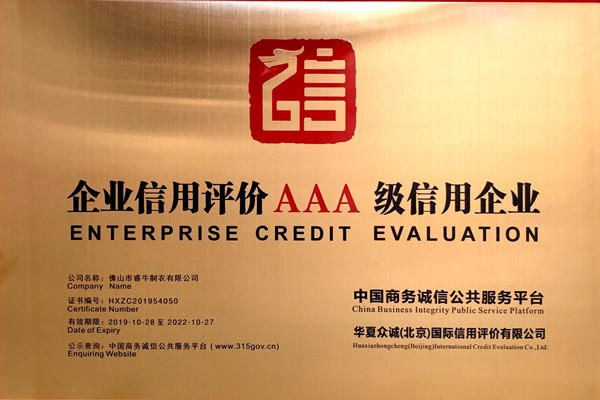 請看一下圖片:佛山市睿牛制衣有限公司——企業信用評價AAA級信用企業;