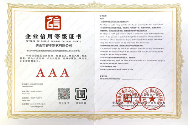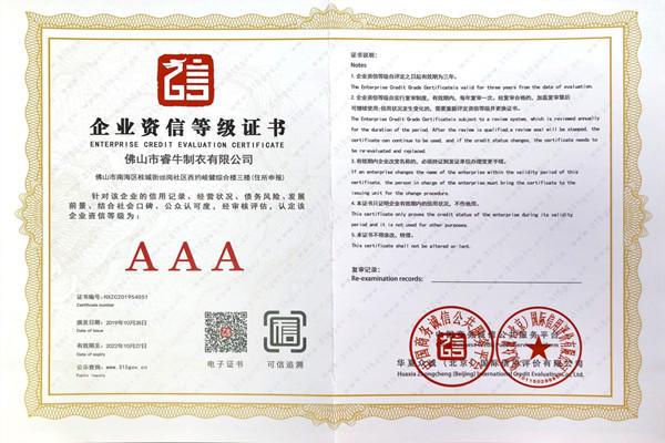 佛山市睿牛制衣有限公司——3A級企業資信等級證書;