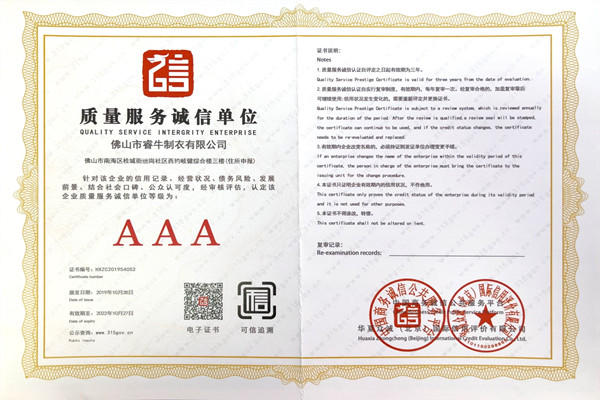 佛山市睿牛制衣有限公司——3A級質量服務誠信單位;