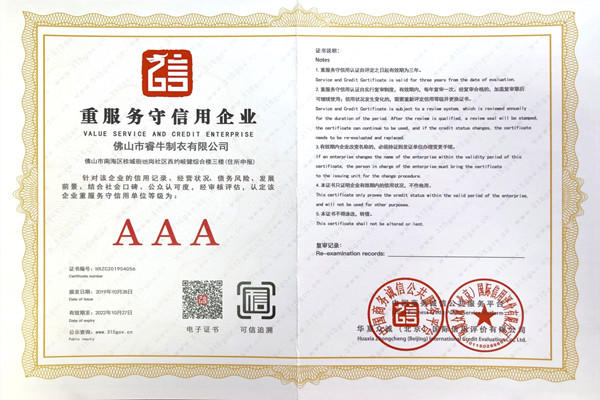 佛山市睿牛制衣有限公司——3A級重服務守信用企業;