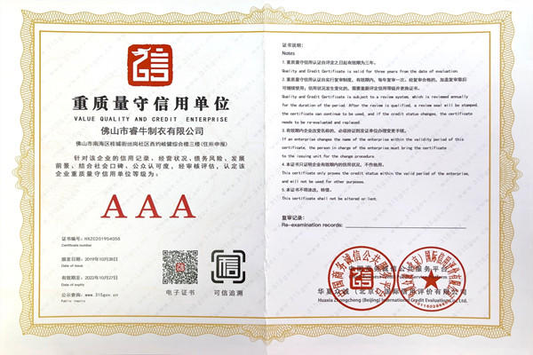 佛山市睿牛制衣有限公司——3A級重質量守信用單位;