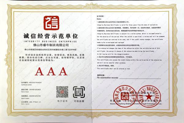 佛山市睿牛制衣有限公司——3A級誠信經營示范單位;