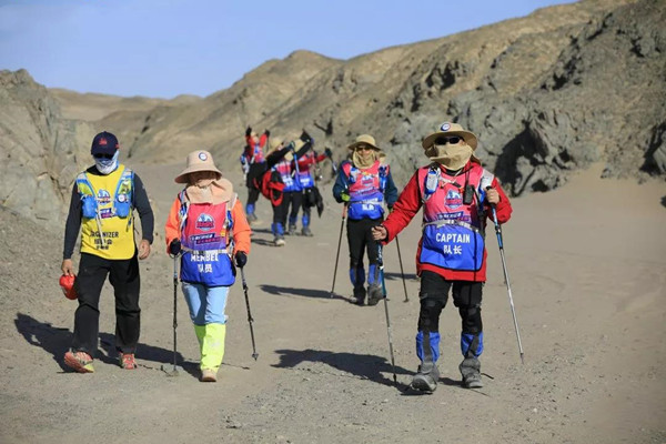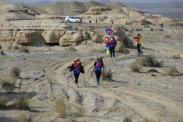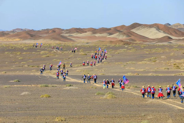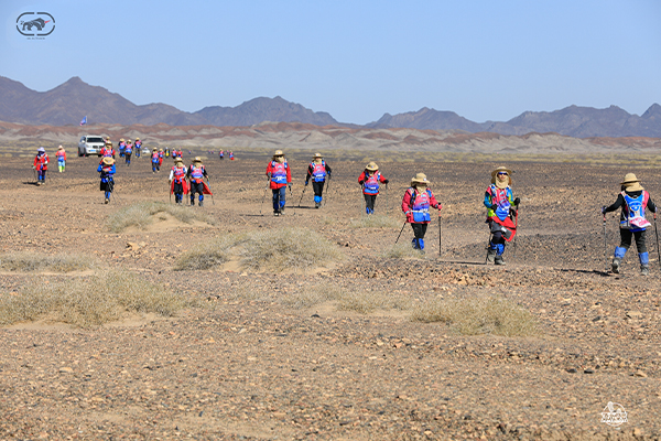 第一天是8小時(shí)25公里,牛商們?cè)谔?yáng)還沒(méi)完全升起來(lái)就開(kāi)始了遠(yuǎn)征前的熱身,原力專業(yè)的教練,激昂的樂(lè)章,鼓舞著雄心勃勃的牛商們,一聲號(hào)令全體出發(fā),萬(wàn)馬奔騰的節(jié)奏開(kāi)始了,彩旗飄飄,紅裝戰(zhàn)衣,藍(lán)色背包,熒光粉的名號(hào)牌,浩浩蕩蕩,塵土飛揚(yáng)!戈壁我們來(lái)了!