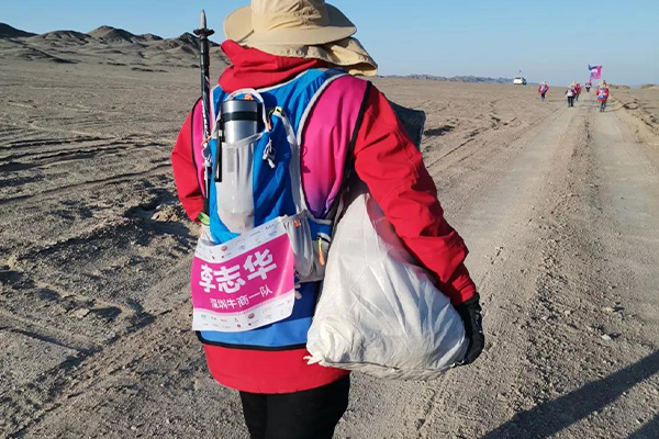 一路上走來(lái),那是最美的照片,當(dāng)我們步履蹣跚的時(shí)候,深圳的李志華他抱著纖維袋,一路撿垃圾,走過(guò)的路他一共撿了17袋垃圾。蒼穹之下戈壁中人是何等的渺小,這一個(gè)小小的舉動(dòng)卻又是多么的高大,讓人敬佩感動(dòng)!